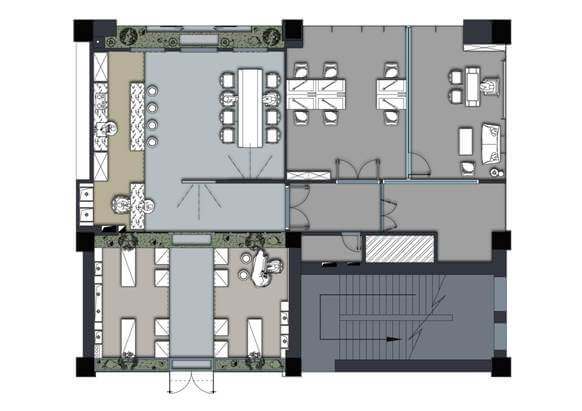 1、弱化過(guò)于商業(yè)化的標(biāo)簽,入口處設(shè)置櫥窗植物造景,將收銀臺(tái)引至廳中,可觀察兩個(gè)方向的入口人流動(dòng)向。